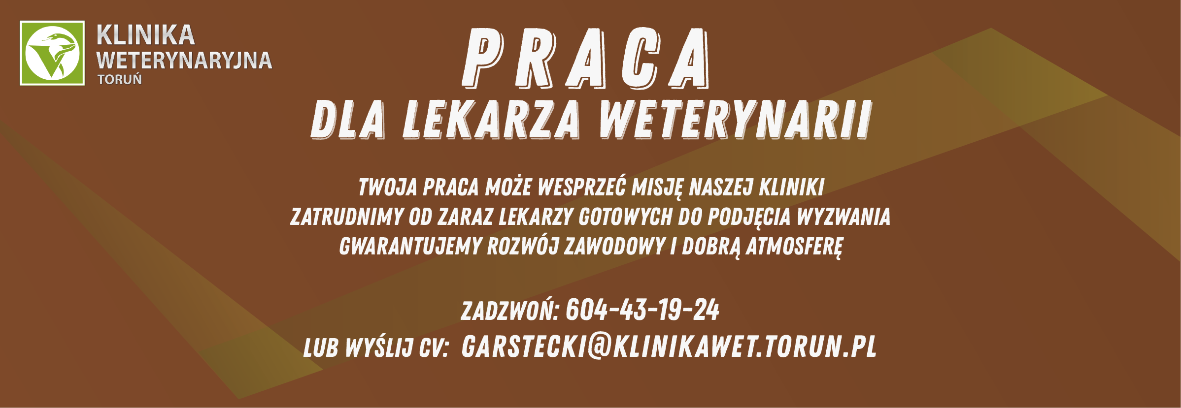 W związku z dynamicznym rozwojem naszej firmy i przeniesieniem do nowo wybudowanej przychodni chcemy powiększyć nasz zespół. Z chęcią przyjmiemy na staż lekarza weterynarii z możliwością późniejszego zatrudnienia. Przychodnia Weterynaryjna 4Łapy w Brodnicy funkcjonuje na lokalnym rynku od 20 lat odnosząc coraz większe sukcesy i pozyskując zaufanie i oddanie kolejnych klientów. Staramy się regularnie szkolić i zapewniamy naszym pracownikom nieustanny rozwój. Ciężko pracujemy każdego dnia ale staramy się być wsparciem merytorycznym i praktycznym dla wszystkich naszych osób pracujących członków zespołu. Każde z nas wnosi mnóstwo energii oraz pozytywnego nastawienia dzięki czemu praca w naszej przychodni przynosi ogrom satysfakcji i radości :) Lecznica opiera się na sprawnie działającej recepcji (wraz z artykułami zoologicznymi). Do dyspozycji lekarzy są 2 gabinety przyjęć z USG, w pełni wyposażona sala chirurgiczna, pracowni RTG i EKG. Posiadamy własny sprzęt do badań laboratoryjnych i korzystamy z usług laboratorium zewnętrznego . Dysponujemy sprzętem do lasero i magnetoterapii. Usługi kierujemy do zwierząt towarzyszących, koni oraz zwierząt gospodarskich. Zabiegi przez nas oferowane obejmują internę, okulistykę, stomatologię, chirurgię miękką i twardą, podstawy rehabilitacji. CV prosimy wysłać na e-mail: 4lapy-brodnica@wp.pl w temacie wiadomości: Rekrutacja Agnieszka i Tomasz Choszczewscy
