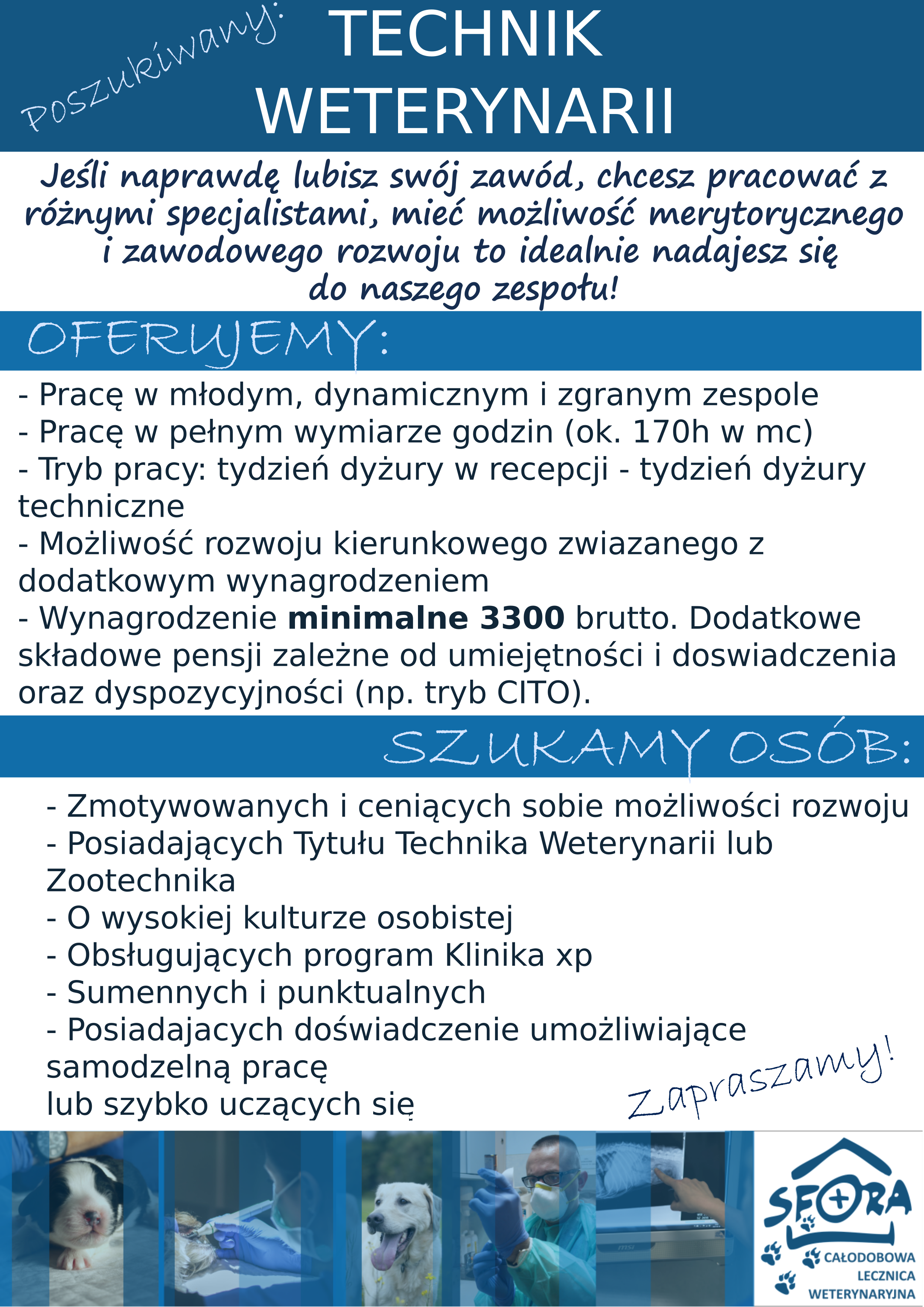 Całodobowa Lecznica SFORA zatrudni samodzielnego technika weterynarii.