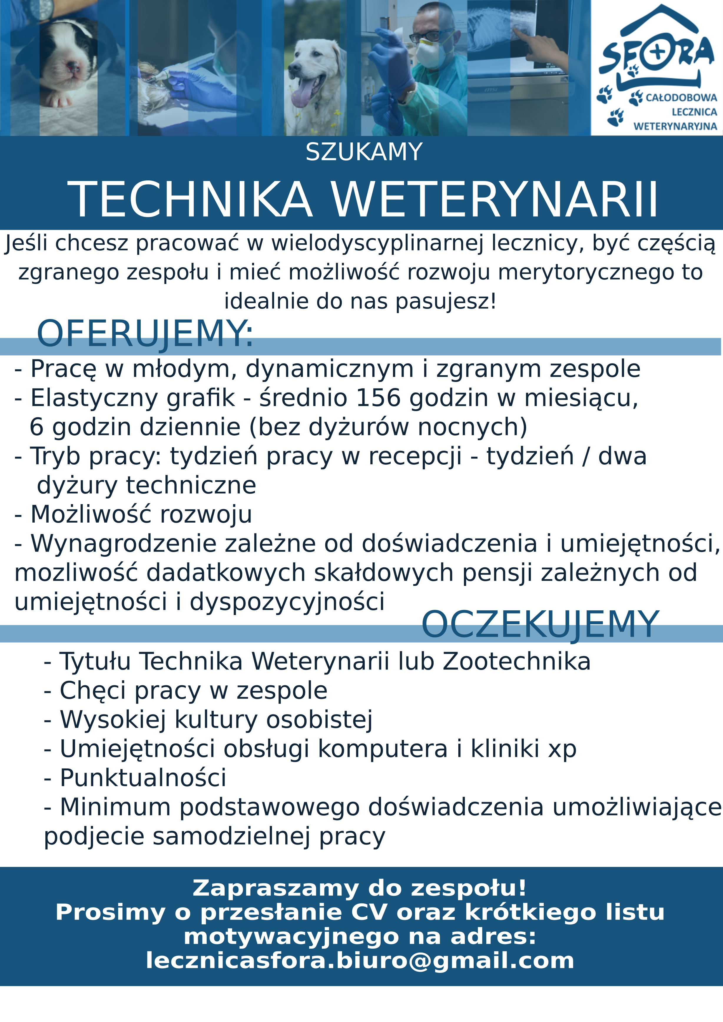 Od ponad roku prowadzimy w pełni wyposażoną, nowoczesną, przyjazną przychodnię dla małych zwierząt w podwarszawskich Książenicach. Szukamy samodzielnej i odpowiedzialnej osoby, która obejmie dyżury internistyczne - wymiar do ustalenia. Oferujemy możliwość rozwoju w zakresie diagnostyki (prowadzonej na miejscu: RTG, USG, diag. mikroskopowa), chirurgii i anestezjologii.