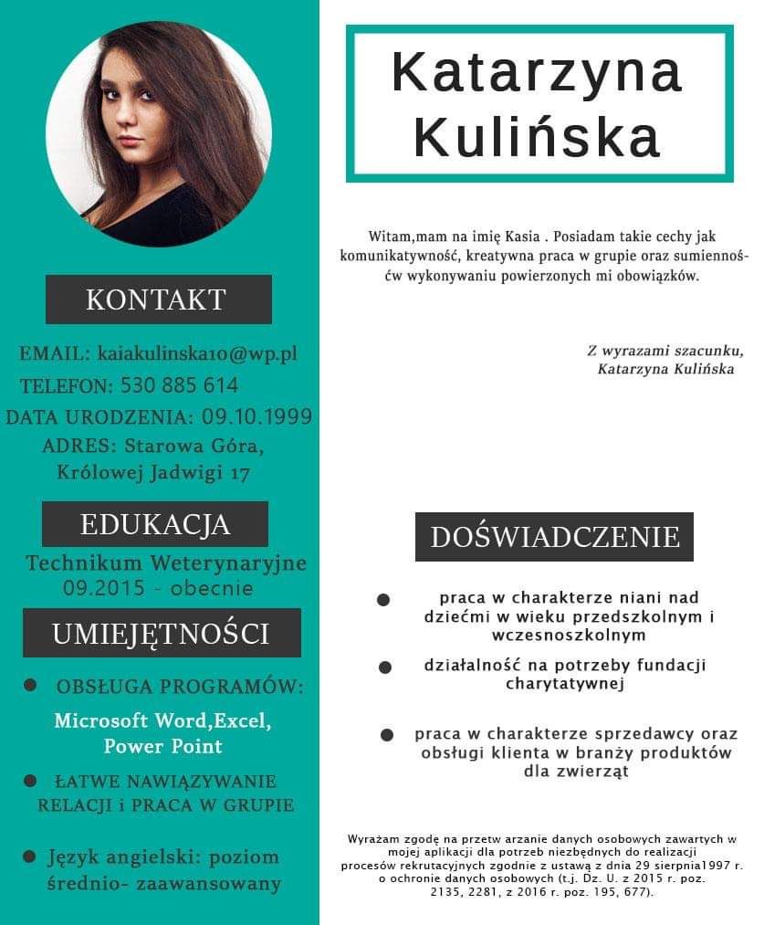 Jestem po 2 miesięcznym stażu w gabinecie dla małych zwierząt Amicus. Chciałabym dalej rozwijać swoje umiejętności oraz nabrać więcej doświadczenia .Jestem osobą sumienną ,samodzielną ,odpowiedzialną ,potrafie pracować w zespole. Mam w sobie wiele pasji i angażuję się w powieżone mi zadania .Posiadam świadectwo maturalne, dypolom technika weterynarii oraz dyplomy potwierdzające kwalifikacje zawodowe .